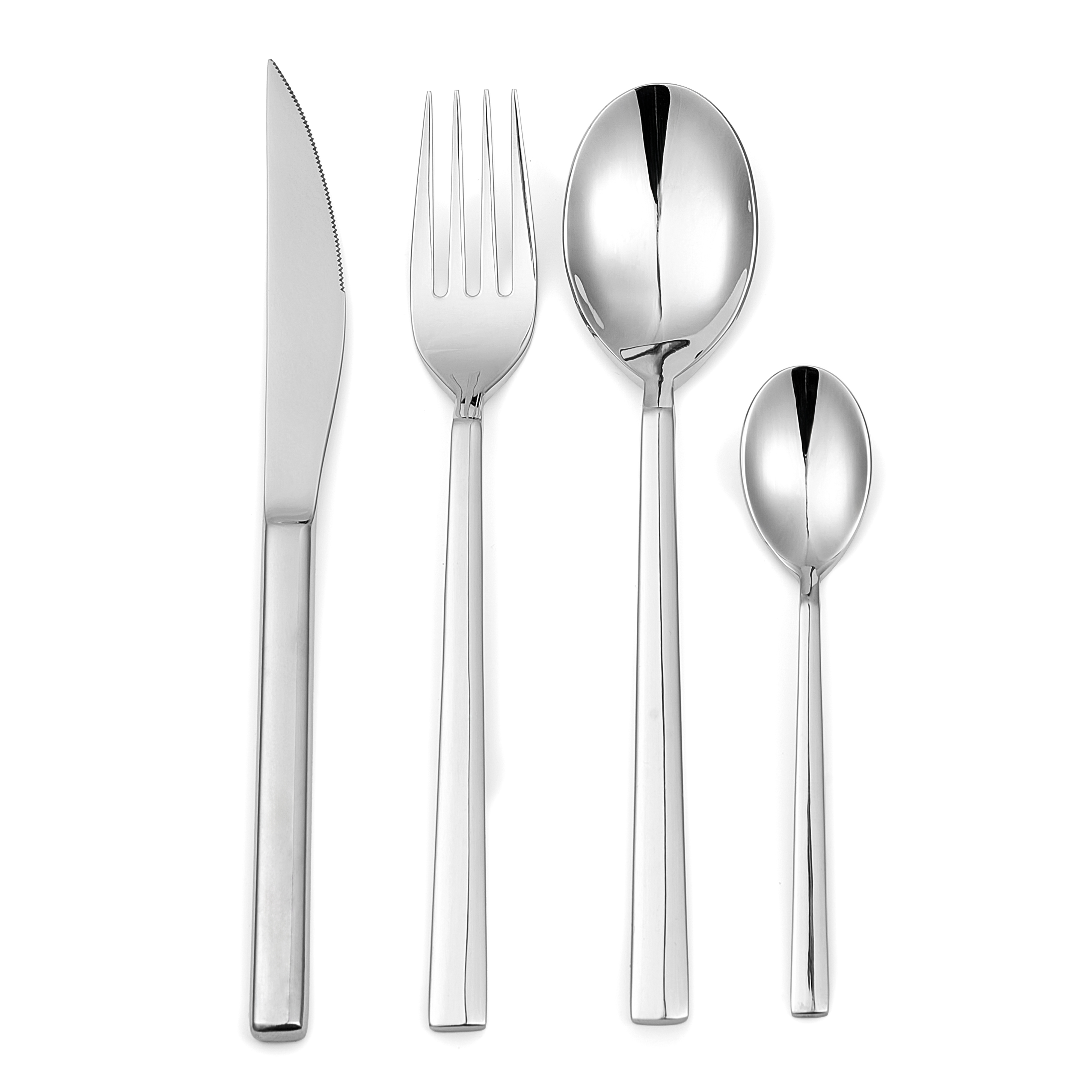 6 couteaux de table : 23,50 cm dont 10 cm de lame 6 fourchettes : 4 mm, 21 cm 6 cuillères : 4 mm, 21 cm 6 cuillères à dessert : 3,5 mm, 14 cm Acier 18/8 Finition Hytra brillante